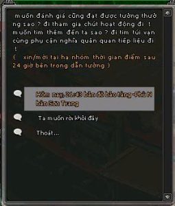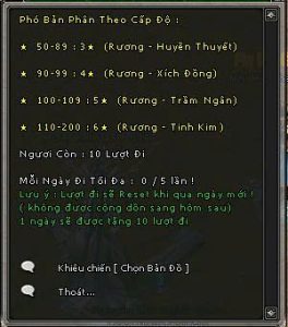 - Bảo rương cổ: Đối thoại sẽ nhận được ngẫu nhiên rương Đồng, Bạc, Vàng, cần chìa khóa tương ứng mua tại Kỳ Trân Các (Ctrl G) để mở